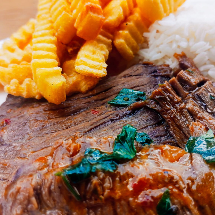 O cupim é um corte bovino suculento com gordura marmorizada. Servido com arroz, feijão, batata frita ou salada.