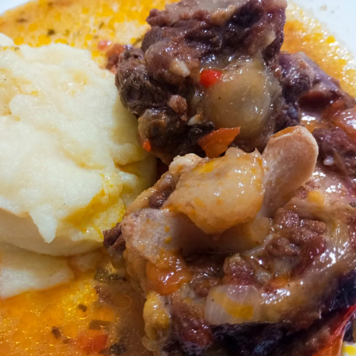 Prato de rabo de boi cozido lentamente com temperos, servido com polenta, arroz e feijão.
