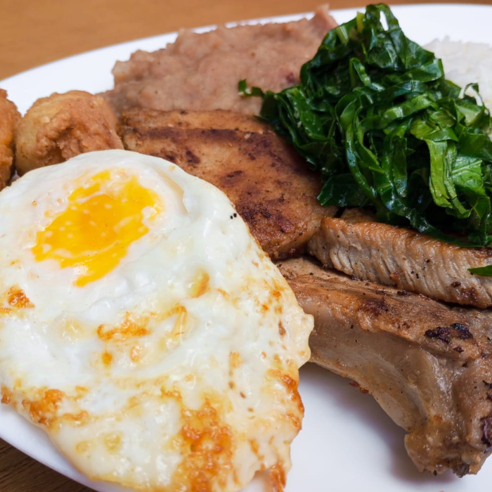 Prato brasileiro de feijão preto com carnes como costelinha suína, carne seca, pé, rabo e linguiça calabresa. Servido com arroz, bisteca. Com opções de: banana a milanesa, couve, farofa, torresmo e vinagrete.